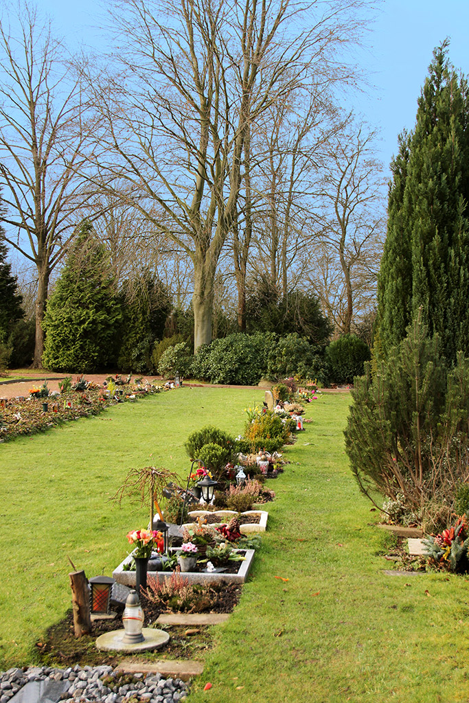 Das Reihengrab liegt in der Reihe mit den anderen gleichartigen Gräbern. Es wird der Reihe nach vergeben. Dieses Grab ist nur für eine einzige Bestattung vorgesehen.